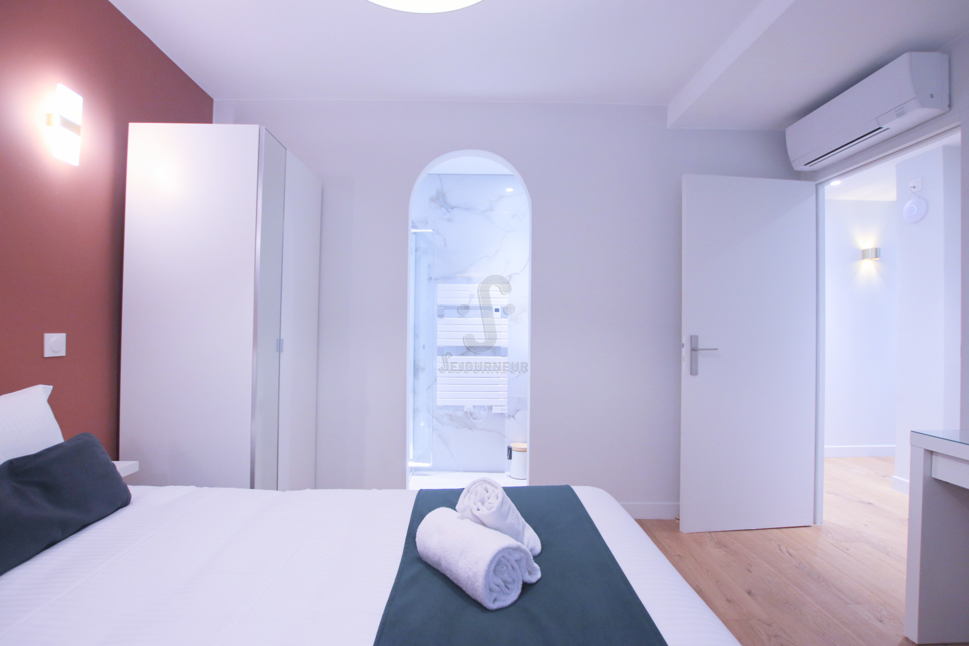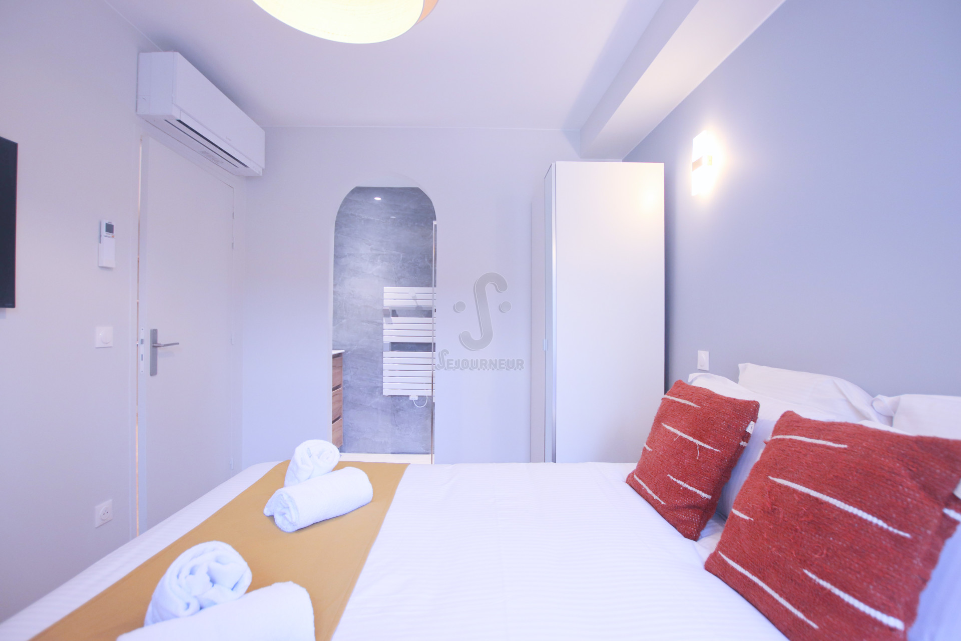 – Bedroom 2: Queen-size bed (160), private bathroom, and air conditioning.