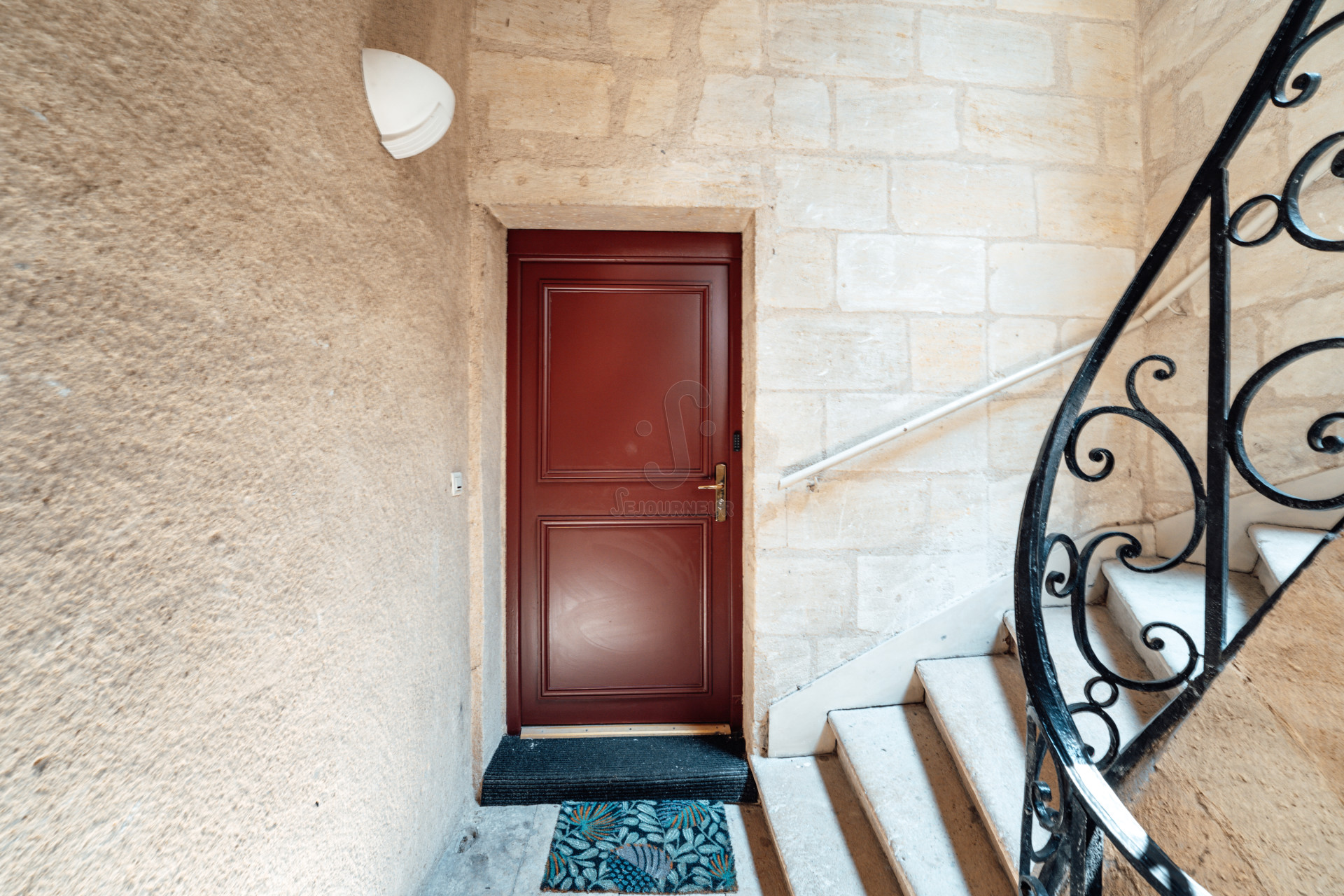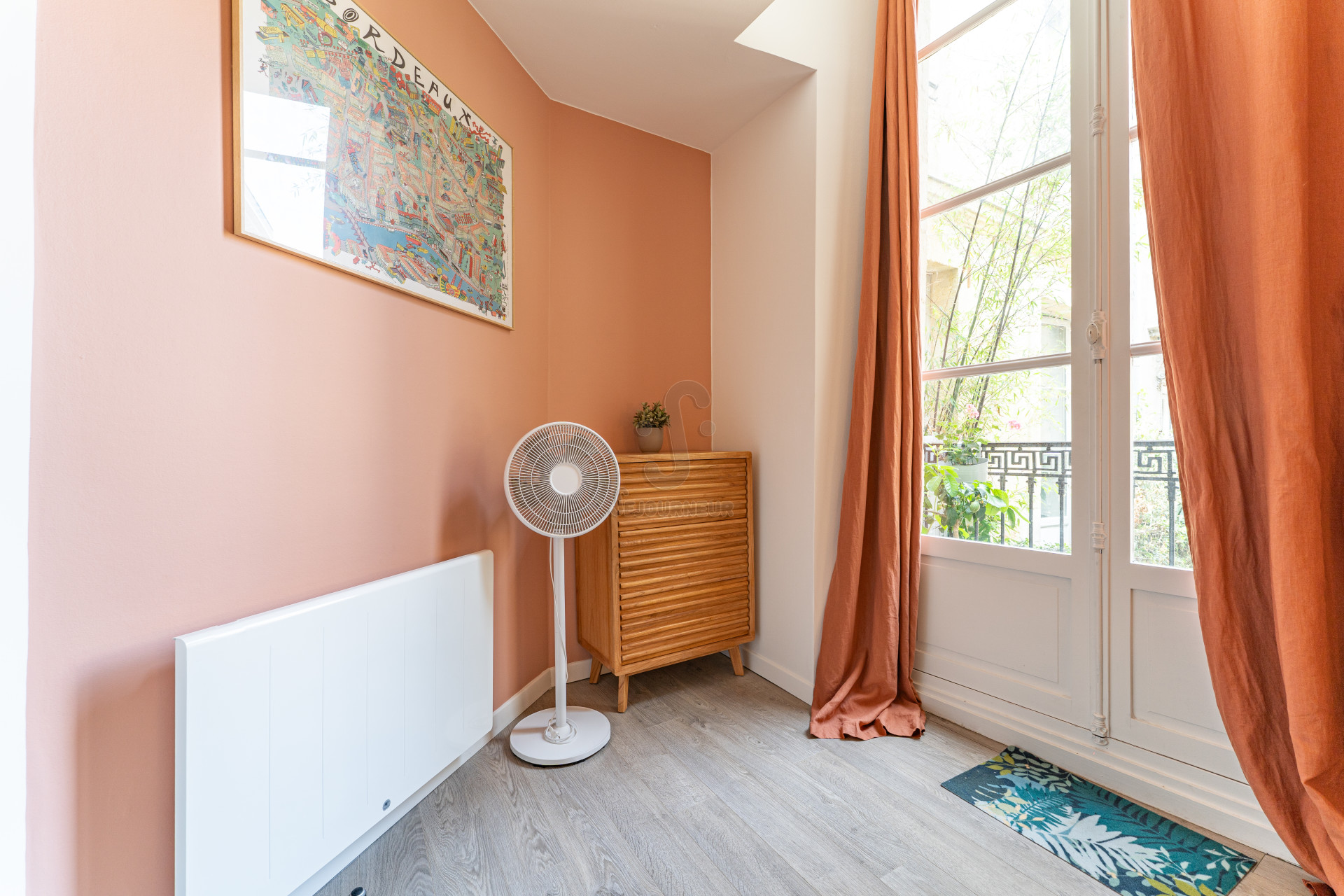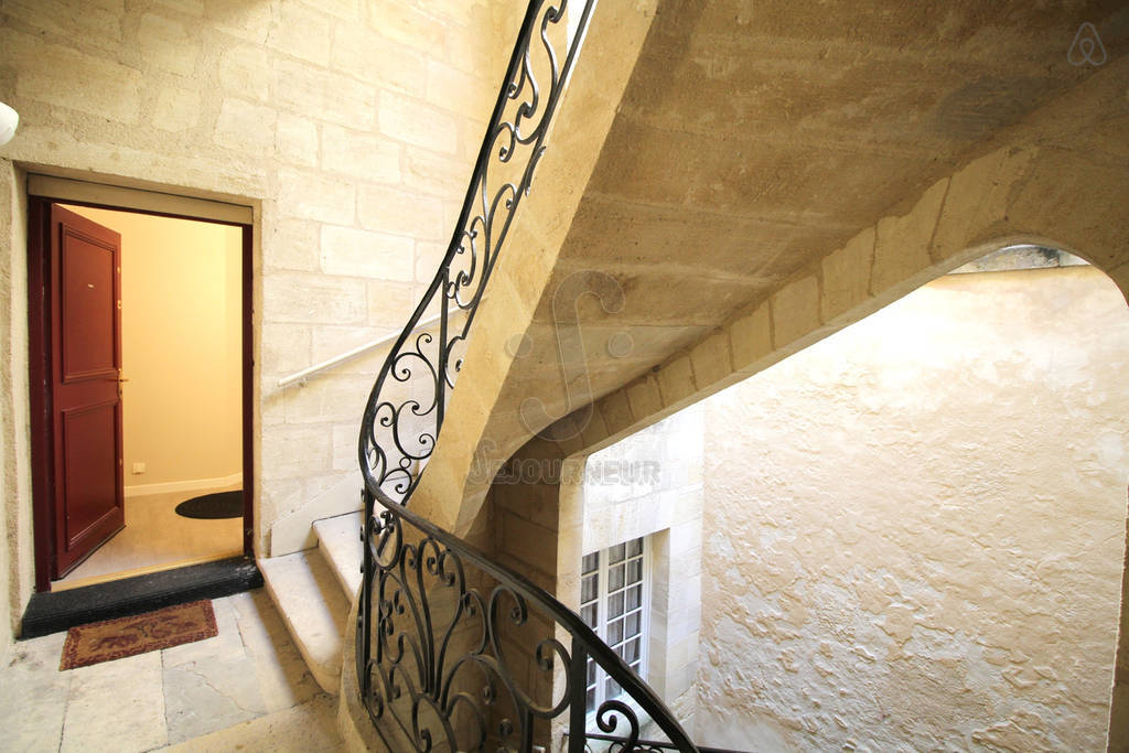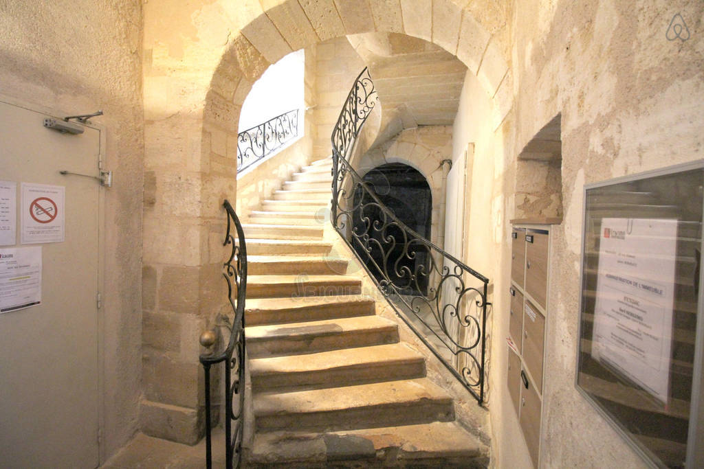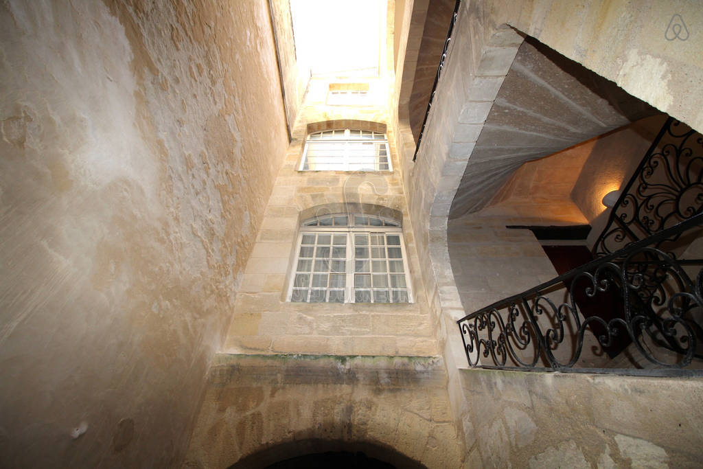 Bien que l’appartement conserve le charme du vieux Bordeaux avec ses escaliers en pierre bordelaise menant à un patio extérieur, il ne manque pas de commodités modernes, telles qu’une télévision et le wifi.