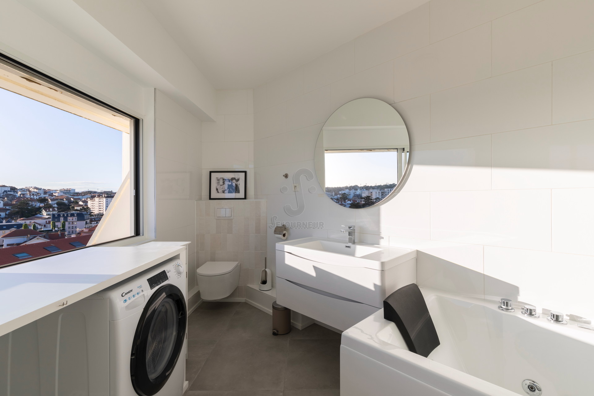 Avec un accès direct et privilégié à la plage Miramar de Biarritz, ce magnifique duplex panoramique peut accueillir confortablement jusqu’à 4 personnes. Situé dans un immeuble emblématique du centre de Biarritz, à seulement 5 minutes du quartier Saint-Charles, l’appartement offre une vue imprenable sur la ville, l’océan et le phare de Biarritz. Son véritable atout : un jacuzzi avec vue, parfait pour se détendre après une journée à la plage.
